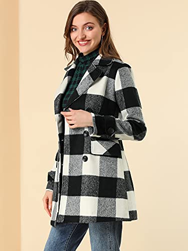 Allegra K Women's Notched Lapel Double Breasted Winter Plaids Coat Black White X-Large