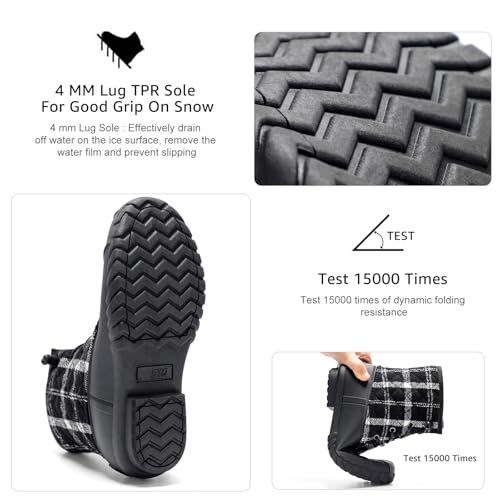 - [ Waterproof Duck Shell ] Duck inspired winter boot with a rubber shell ensures durable wear and waterproofing for a comfortable and drier foot environment. Long-distance Walking Test: After the researcher walked 16Km in the snow, her feet stayed dry and fresh, [ Traction ] Non-marking TPR outsole with lugs and wave pattern for wet and dry traction, perfect for waterproof rain boots. How It Works: 4mm Lug sole effectively drains off water on the ice surface, removes the water film and prevents slipping, [ Warmth ] Micro-fleece lined provides warmth under foot for a warm, cozy feel. These snow boots feature thermolite insulation rated to -15℉/-26℃, lock feet temperature between 28-30℃/82.4-86℉, keep your feet warm all day, [ Smooth Design ] These waterproof duck boots feature a side zipper that has been tested 1500 times, running smoothly and quietly. I Bet You Don't Want to Get Stuck! While inside hidden PU patch prevents zipper rubbing your ankle. Quilted synthetic shaft, barrel tie laces with rustproof eyelets are stylish and functional for a secure fit, and zipper for easy on and off, [ Occasion ] When cold weather rolls in, trust your comfort to the women's waterproof duck boots. Pair these ankle boots with any outfit from dusk until dawn! From jeans to dresses, these boots are a sure-fire way to top off any outfit, perfect for outdoor, rainy day, snowy day, fits for spring, fall, winter