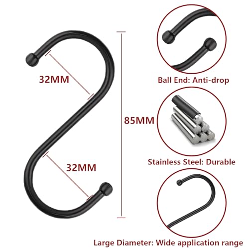 - 【High Quality】S hooks Made of iron, the S hooks are stylish, rustproof and durable enough to hang heavy objects, 【Versatile Organiser】The black S hook can be used in the kitchen to hang pots and pans, in the bathroom to hang towels, in the wardrobe to hang clothes and scarves, and to hang flower pots and garden tools, 【Unique Design】The round balls at the ends of the S hooks help to secure items on the shelf, preventing them from slipping off easily and without scratching any surfaces, 【Easy to Use】No screws or nails are required for installation. As these S hooks are removable and easy to pack, you can even use them for outdoor use, 【Stylish and minimalist】S hooks are eco-coated in black frosted material, which effectively prevents fingerprints and the build-up of dust and oil. The elegant S hook offers great aesthetic appeal and not only fits in with modern design, but also reduces annoying clutter