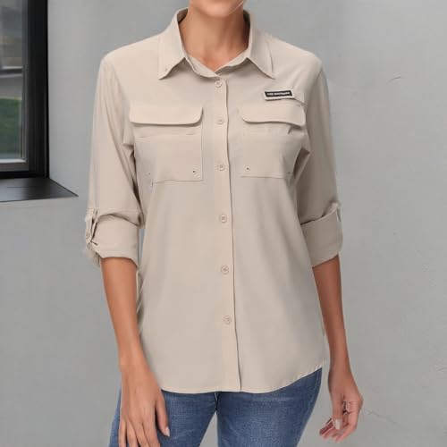 BASSDASH Women's UPF 50 Long Sleeve Fishing Hiking Button Down Shirt Performance Quick Dry FS21W, Khaki, Large