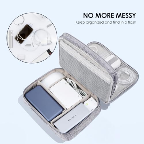 - 【Spacious & All-in-One electronics organizer】This large-capacity tech organizer (10.06"×3.93"×7.87") holds more than standard pouches, neatly storing all your messy cables (USB/charging cords), electronics (Ipad Mini, power banks, hard drives), and small accessories (SD cards, earbuds). Perfect for home storage or travel—keep everything in one place., 【Smart Dual-Layer Design】This travel organizer features two specialized compartments.Small-item layer: Elastic bands and mesh pockets for cables/accessories.Large-item layer:Adjustable padded dividers for tablets (up to 11") and larger devices. Customize layouts to suit your needs., 【Customizable Storage with Protective Dividers】This tech organizer includes 3 detachable dividers with Velcro straps on the bottom layer,you can adjust them to create custom spaces for tools, cameras, or bulky electronics., 【Compact & Travel-Friendly】Lightweight (128g) and slim, tech pouch fits easily into backpacks, suitcases, or drawers. Includes a hand strap for quick carrying. Great for business trips, vacations, or office commutes., 【Waterproof & Shockproof Protection】The organizer bag is made with waterproof, scratch-resistant, and shock absorption premium nylon material.Shields contents from spills, dust, drops, and scratches—ideal for travel or daily use.