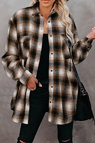 Womens Casual Long Sleeve Button Up Lapel Collar Plaid Shacket Jacket Lightweight Long Coat Outwear (Brown,Small,Alpha,CA/US,Adult,Female,Small,Regular,Regular)