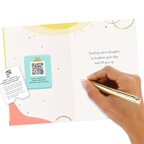 - When friends or family members are going through a difficult time, a card is more appreciated than ever. This one, with a unique scan code inside for adding a personalized video greeting, is sure to bring a little sunshine to anyone's day., Card cover features an abstract painted design with gold foil accents, and the message: "A circle of caring surrounds you." Inside reads: "Sending warm thoughts to brighten your day and lift you up.", Remove the tab inside the card and scan the QR code on the back of the tab to create a video. (Invite others to upload their photos and videos too!) Recipient then scans the QR code in the card to watch, save, and enjoy over and over again., Personalized thinking of you card measures 5" x 7.2" and comes with a coordinating envelope. iOS and Android compatible. Use camera to activate—no app required., Printed on high quality paper stock, Hallmark's greeting cards are made with paper from well-managed forests.