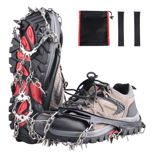- Reliable Grip with 24 Spikes: Featuring 24 high-quality 201 stainless steel spikes and double-welded chains, these crampons provide durable rust-resistant traction on various icy surfaces to prevent slips, falls, and sideways movement while ensuring safety, Reinforced Flexible Material: Made of thick cold-resistant thermoplastic elastomer (TPE) that maintains flexibility down to -40°C, this material offers high elasticity and tear resistance while adjustable straps enable easy wearing and lasting comfort, Wide Range Application: Available in three sizes (M, L, XL) suitable for adults, teenagers, and seniors, these ice cleats perform reliably on icy roads, muddy terrain, and wet grass for activities like dog walking, hiking, climbing, and ice fishing, Custom Adjustable Fit: Equipped with adjustable straps that secure the cleats snugly to boots and shoes, providing a personalized fit for enhanced comfort and stability during all winter activities, Lightweight Portable Design: Compact and pocket-friendly with an included carry bag, these crampons easily store in backpacks or cars and fit various footwear including sports shoes, hiking boots, and casual shoes
