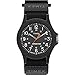- Adjustable black 20mm fabric Fast Wrap strap fits up to 8-inch wrist circumference, Black dial with full Arabic numerals; date window at 3 o'clock; 24-hour military time, Durable black 40mm resin case with acrylic crystal, Indiglo light-up watch dial; luminous hands, Water resistant to 50m (165ft: in general, suitable for short periods of recreational swimming, but not diving or snorkeling
