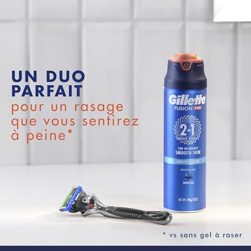 - 2IN1 PROTECT + HYDRATE: Helps protects against shaving irritation and leaves your skin feeling hydrated., COOLING EFFECT DURING SHAVING: Helps give you a cooling feeling., SENSITIVE COOLING FORMULA WITH A TOUCH OF EUCALPYTUS AND ALOE VERA: Specifically formulated for Sensitive Skin. Made with a touch of Eucalyptus and Aloe Vera., WORLD'S #1 SHAVE GEL AND FOAM BRAND: There's a reason Gillette's been around for 100 years, Gillette knows what men want in a shave., USE WITH GILLETTE FUSION5PROGLIDE RAZORS: Combine the Gillette FusionPro Sensitive Shave Gel with Gillette Fusion5ProGlide Razors for a shave you barely feel* (*vs. no shave gel).