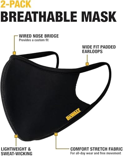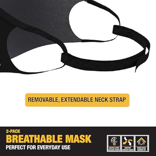 DEWALT Breathable Cloth Face Masks — Adjustable Earloops and Removable Neckstrap — Black — 2-Pack