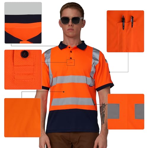 A-SAFETY Hi Viz Polo T Shirt Reflective High Visibility Safety Yellow Orange Short Sleeve Shirt,Navy Bottom(Orange 5XL)