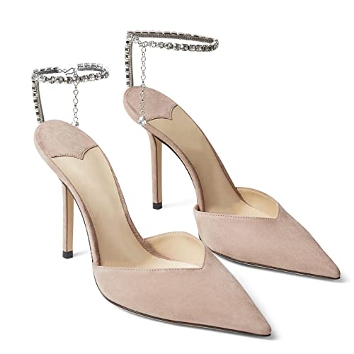 LauraVicci Women's Heeled Sandals Crystal Chain Ankle Straps Rhinestones Buckle High Heels Stiletto Slip On Wedding Party Satin Dress Shoes Size 11 Beige
