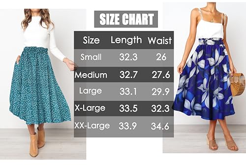 - High quality soft chiffon spring summer skirt,100% Polyester Elastic waist flare closure skirt,easy can dress up and down., Stretchy high waisted, flowy and swing pleasted a line fashionable and polka dot printed midi long pleated skirt, two pockets, A-line, polka dot, maxi skrit, midi skrit., Elastic waist flare closure skirt,easy can dress up and down., It can be wore on casual, daily, travel, holiday, beach occasions,Perfect for spring, summer and autumn., Easy to wash by hands or machine wash,Do not Wring and bleach.
