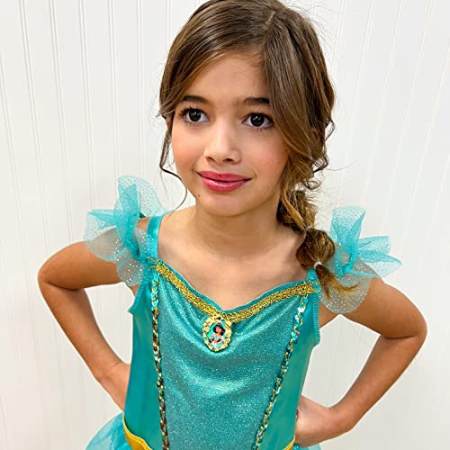 - AUTHENTIC GIRLS JASMINE COSTUME - This officially licensed Aladdin Disney Jasmine costume for kids is a fresh update to her already chic look, HIGH QUALITY ALLADIN JASMINE OUTFIT - Made with polyester with reflective metallic trim, these Jasmine Halloween costumes for girls are durable and comfortable for your child to wear all day long, PRINCESS JASMINE COSTUME FOR GIRLS FOR DRESS-UP - Whether it's for Halloween, a school play or just for fun, this Jasmine Aladdin costume is perfect for any dress-up occasion, COMPLETE DISNEY COSTUMES FOR KIDS - This Princess Jasmine costume comes complete with a cameo, draped sleeves and foiled details at the edges to complete her look, DISNEY COSTUMES MADE WITH CARE - Attention to detail makes this the prefect Disney Aladdin Jasmine dress for girls - Be sure to check the sizing chart to ensure the best fit