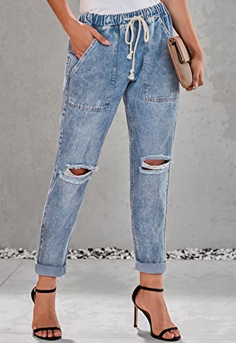 Metietila Women's Casual Pull-on Distressed Jeans Elastic Waist Denim Joggers Stretch Pants for Women Light Indigo X-Large