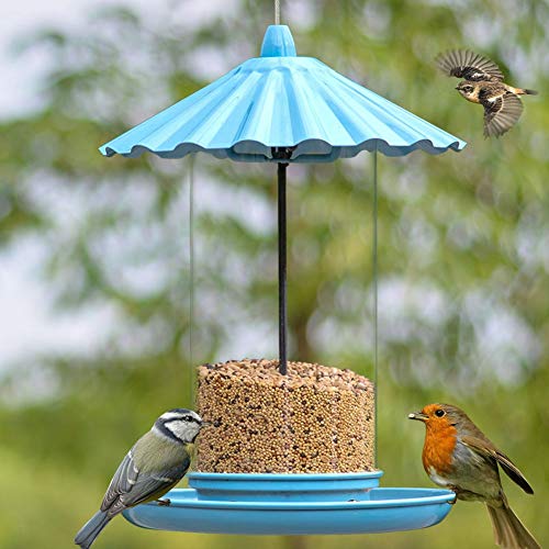 - ★ Durable:This bird feeder made of environmentally friendly metal material, anti-corrosion and anti-aging, safe and non-toxic,durable for long time use。With the rotating lid the feeder can be easily opened and filled., ★ Protection:Inclined roof protects bird seeds from rain; Bottom tray with perch allows birds to feed from all angles., ★ Transparent housing is convenient for you to observe the inner food so you can refill seeds in time., ★ It can hold nuts,grass seed,millet,grain,rice or crumbs and more kinds of bird food, easy to fill up and hanging;, ★ Great for outdoor use, you feed your pet or wild birds at ease, and watch them on your leisure afternoon.