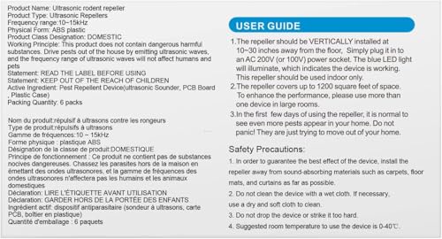 - Advanced Ultrasonic Technology. Utilizes upgraded chip technology to emit eco-friendly electromagnetic waves that help repel common household pests including mice, insects, and spiders* (*Note: Effectiveness may vary based on infestation severity. Continuous use for 3-4 weeks recommended for optimal results)., 1,200 Sq.Ft Comprehensive Coverage. Each pest repellent effectively protects areas up to 1,200 square feet. For multi-room coverage, we recommend installing one device per living space with centralized placement., lug-and-Play Installation. Simply connect to any standard wall outlet. For maximum efficiency: Position vertically 7-31 inches above floor level, maintain unobstructed 3-foot clearance from furniture/drapes, initial results typically visible within 14-21 days of continuous operation, Family & Pet-Friendly Design. Features: Silent operation imperceptible to humans/pets, chemical-free, non-toxic pest management, zero physical contact required with pests., 24/7 Customer Support. Backed by our dedicated North American support team ready to provide technical assistance within 24 hours of inquiry. Includes 2-year limited warranty.