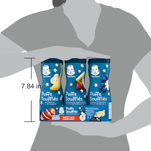 - For Babies 8 Months and Up: GERBER Puffs are a nutritious first snack for babies, Baby's First Snack: Star-shaped GERBER Puffs are baby-led friendly, easy-to-dissolve, perfectly shaped and sized to help build baby's oral and motor skills, A Healthy Baby Snack: Each nutritious serving of GERBER Puffs contains 4g of whole grains and is a good source of iron and zinc to help support baby's growth and development, Wholesome Ingredients: GERBER Puffs are made from puffed cereal grains and real apples; They contain no artificial colours, no artificial flavours, and are made with non-GMO ingredients, Delicious Variety: This variety pack includes 2 each of 3 favourite flavours -- Banana, Strawberry Apple, and Blueberry Vanilla, Snacks On-The-Go: Perfect for baby's snack time at home, GERBER Puffs convenient reclosable canisters are also convenient to slip in your bag
