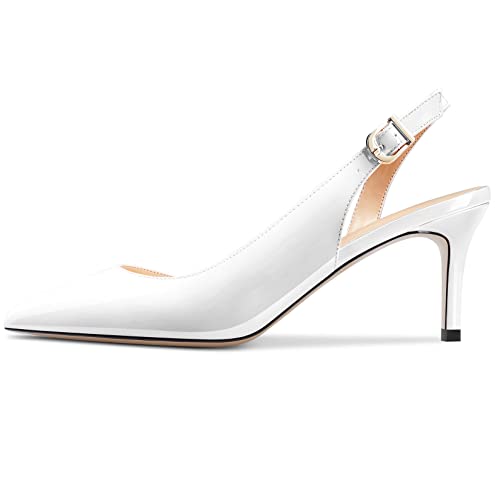 Aachcol Women Stiletto Mid Low Kitten Heel Pumps Ankle Strap Slingback Pointed Toe Dress Shoes Office Party Wedding Patent 2.5 Inch, White, 9.5