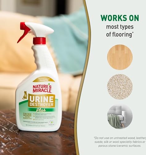 - FOR CAT URINE MESSES: Begins to break down and remove stains immediately on contact, POWERFUL FORMULA: Just soak the affected area, allow to work for 15 minutes, then blot up stain with a clean cloth, ENZYMATIC FORMULA: Continues working as long as any bio-based mess is still present, TRUSTED BRAND: From the maker of Nature’s Miracle products, the pet stain and odor removing brand you trust, because it works!, SAFE FOR PETS AND HOME: When used and stored as directed, this formula can be used around your pets and in your home