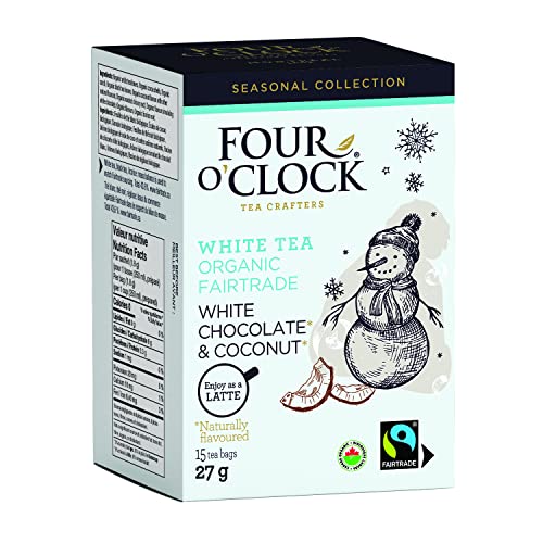 Four O'Clock White Chocolate & Coconut White Tea, Organic, Fairtrade, Holiday Winter Collection, Low Caffeine, All Natural, Sugar-Free, Kosher, Gluten-free, 15 Tea Bags