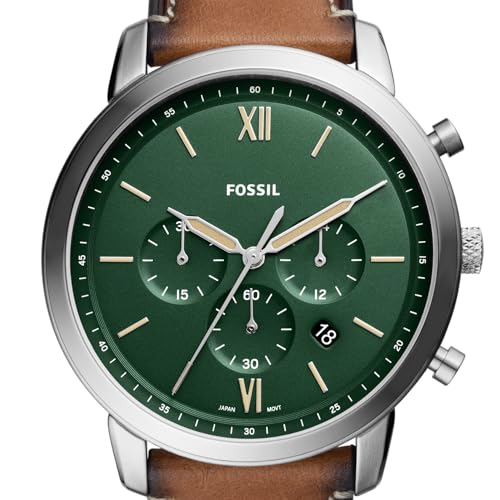 - This 44mm Neutra watch features a green matte dial, chronograph movement and tan LiteHide leather strap. This timeless watch is inspired by mid-century architecture, with its simple proportions and symmetry. A sculpted case and blend of brushed and polished finishes give Neutra a refined, yet versatile profile that’s made to be dressed up or down., Case & Movement: 44mm case, 22mm band width, hardened mineral crystal lens resists scratches, accurate Quartz movement with chronograph analog display and date window, three subdials to track minutes, seconds, and 24-hour time, stopwatch functionality, imported., Dial: Round silver stainless steel case, with a green matte dial and cream accents., Watch Band: Tan brown, LiteHide genuine leather band with a secure adjustable buckle closure for a customized fit; interchangeable with all 22mm Fossil watch straps., Water Resistant: Up to 50m (165ft): Wearable for short periods of recreational swimming and showering, but not diving or snorkeling; 5 ATM., LiteHide Leather is leather that has undergone resource-efficient raw materials processing that significantly reduces water consumption, wastewater pollution, CO2 emissions, and waste.