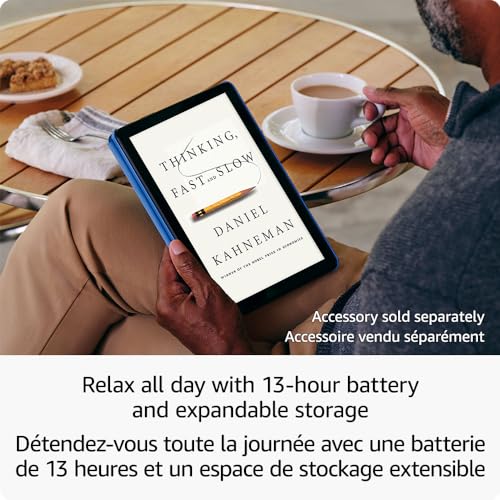 - Do what you love, uninterrupted — 25% faster performance than the previous generation and 3 GB RAM are ideal for seamless streaming, reading, and gaming., High-def entertainment — A 10.1" 1080p Full HD display brings brilliant colour to all your shows and games. Binge watch longer with 13-hour battery, 32 or 64 GB of storage, and up to 1 TB expandable storage with micro-SD card (sold separately)., Thin, light, durable — Tap into entertainment from anywhere with a lightweight, durable design and strengthened glass made from aluminosilicate glass. As measured in a tumble test, Fire HD 10 is 2.7 times as durable as the Samsung Galaxy Tab A8 (2022)., Stay up to speed — Use the 5 MP front-facing camera to Zoom with family and friends, or create content for social apps like Instagram and TikTok., Ready when inspiration strikes — With 4,096 levels of pressure sensitivity, the Made for Amazon Stylus Pen (sold separately) offers a natural writing experience that responds to your handwriting. Use it to write, sketch in apps like OneNote, and more., Family friendly — Amazon Kids offers easy-to-use parental controls on Fire tablets. Subscribe to Amazon Kids+ for access to thousands of books, popular apps and games, videos, songs, and more., Designed for sustainability – This device is made from 12% recycled materials. 98% of this device packaging is made of wood fiber-based materials from responsibly managed forests or recycled sources.
