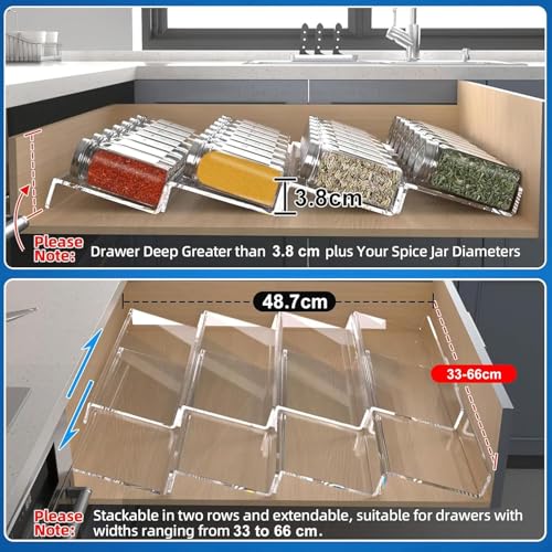 - 【Hold up to 28 Standard 4oz Spice Jars】Spice rack drawer with a tiered design provides plenty of storage space, 1 sets of 4 Tiers (4 Pieces ), each 33cm L x 12.7cm W x 3.5cm H. Free combination and expand to 66 x25cm can hold up to 28 standard 4-ounce spice jars. (Jars and Labels not included), 【Fits Most Drawers, Cabinets】Expandable and slim profile fit drawer insert Width: from 33 to66cm, High: Greater than 8cm. Place it in kitchen drawers, cabinets, pantries, shelves, cupboards, or on countertops. Perfect for storing herbs, spices, curries, seeds, salts, baking supplies, and more., 【Quality Construction】Made of transparent food-grade acrylic, sturdy and durable. The acrylic spice rack tray will not crack, warp, stain, or splinter like bamboo, metal, or wood organizers. Clean with mild soap and water; Do not place in dishwasher., 【Easy to Use】No tool is needed, place them in kitchen drawers and expand them to the size that works best for a custom fit. The slanted levels make it quick and easy to read the labels on spice bottles, identify their contents and locate the item you need., 【Multi-function】In drawer spice rack not only can be used to organize curry, salt, pepper, and other condiments but is also a good choice for finishing nail polish, lipstick, perfume, or some medicine bottles.