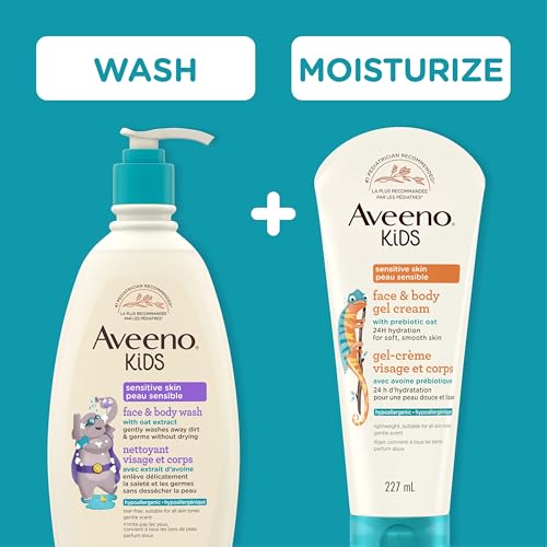 - The Aveeno Kids Sensitive Skin Face & Body Wash is specially designed for kids, this hypoallergenic face and body wash contains oat extract to leave skin moisturized and smelling fresh. This product comes in a 532 milliliter bottle., Aveeno Kids Face and Body Wash Gently washes away dirt and germs without drying kids’ developing and sensitive skin. The Aveeno Face and body wash is formulated with oat extract to cleanse without stripping skin., Created with sensitive skin in mind, Aveeno Kids Face and Body Wash uses oat extract to cleanse skin. The sensitive skin body and face wash is hypoallergenic, tear-free, and contains no phthalates, sulfates, dyes, or phenoxyethanol., To use this 2-in-1 body and face wash, dispense the Aveeno for sensitive skin gel onto a wet washcloth or hands and apply to body. Upon application, lather into skin and then rinse off. This product is suitable to use daily., The 2-in-1 Aveeno Kids Sensitive Skin Face & Body Wash is from a dermatologist recommended and pediatrician recommended brand. With its unique oat extract formula, it is guaranteed to cleanse skin without stripping it of natural oils.