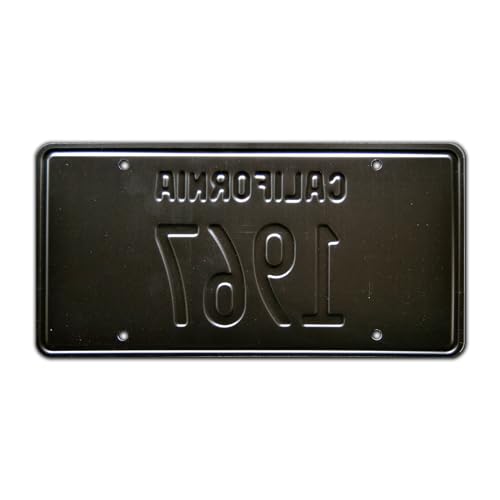 - California license plate style and colors (Black & Yellow), Standard USA plate dimensions (12" x 6"), Metal stamped / embossed aluminum, Shrink-wrapped