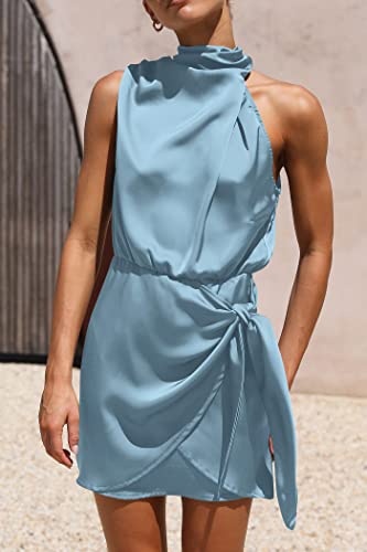 PRETTYGARDEN Women's Short Formal Satin Dress 2026 Summer Sleeveless Mock Neck Tie Waist Cocktail Party Dresses (Light Blue,Small)