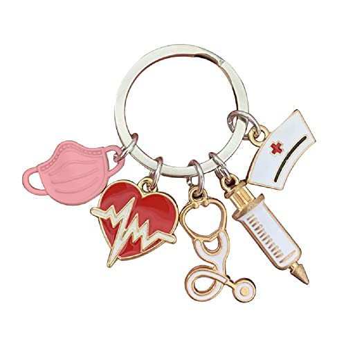 Caiyao Nurse Doctor Keychain 5 charm Graduation Gifts Mask Medical Tool Injection Syringe Stethoscope Nurse Cap, Pink, middle