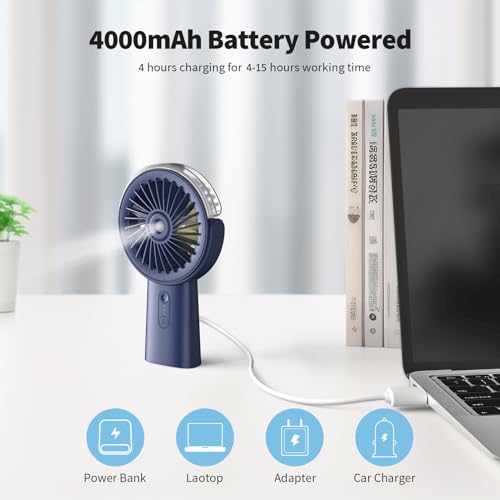 - Beat the Heat, Fast Cooling: Experience refreshing cool wind AND a fine, cooling mist simultaneously for comfort in hot weather. UPGRADED: Enhanced spraying effect! Includes a 20ml built-in tank + a bonus 40ml refill bottle for ~30 minutes total mist time, Massive Battery Life: Powered by a robust 4000mAh rechargeable battery, enjoy 4-15 hours of runtime (varies by fan speed). Stranded with a dead phone? No worries! This versatile misting fan also doubles as a convenient emergency charge to recharge your devices on the go, Handheld OR Desk Fan: Your Choice! The included sturdy base makes it incredibly versatile. Use it handheld for cooling anywhere outdoors, or set it down securely on your desk, table, or countertop as a mini desk fan. The base features a non-slip pad to keep it stable during use, Customizable Comfort: 3 Speeds & 90° Tilt. Equipped with a high-performance motor that delivers comfortable airflow in just 2 seconds. Choose from 3 adjustable fan speeds and easily tilt the head up to 90 degrees to direct the cool wind and mist exactly where you need it for any situation, Portable & Everything Included: Its compact design slips easily into small bags, delivering refreshing cooling anywhere, anytime – at home, the office, the beach, park, gym, camping, festivals, traveling, or waiting in line. You get: 1 Portable Misting Fan, USB-C Charging Cable