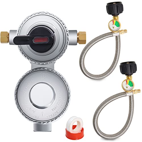 - Updated 2 Stage Auto Changeover LP Propane Gas Regulator : Suitable for RVs, trailers, trucks with dual propane tanks, can switch automatically. When the first tank runs out, our RV propane regulator automatically switches to the second tank, Universal Regulator Specifications : The inlet is a 1/4" SAE inverted flare and the outlet is a 3/8" NPT female pipe thread. included 2 of 15''stainless braided QCC 1/4" inverted male flare rv pigtail propane hose with gauge for connect the auto changeover regulator to the propane or propane tank supply, Features : 2 Stage Propane Regulator allows you to connect 2 Propane tanks and the regulator automatically switches over to the second tank once the first one runs out. The propane switch adjustment knob indicator that changes from green to red when cylinder needs to be filled, High-quality Material : RV Propane Regulator Kit are made of premium die-cast aluminum and solid brass , with good anti corrosion and heat-resistance performance to ensure you safe leakage free operation, Package includes 1 pcs 2 Stage RV Propane Regulator with 2pcs 15 inch Stainless Braided Propane Pigtail Tank Hose with Gauge (Not the 1/4" Male NPT. Please check your connector before you order it. ). If you are not completely satisfied with our RV propane regulator, please feel free to contact us and ask for a replacment
