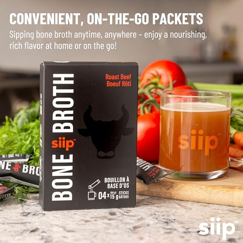 Siip 4-Pack Roast Beef Bone Broth Powder, Single-Serve Sticks | Made in Canada | Beef Bouillon | High in Clean Protein & Collagen | No MSG or Artificial Ingredients | Keto, Paleo | Add Water & Stir