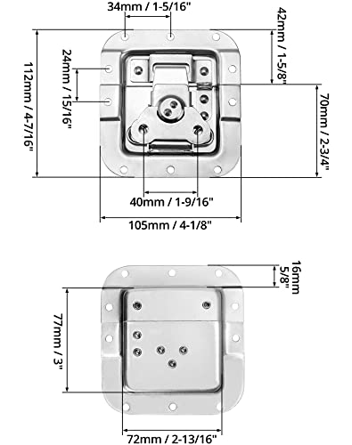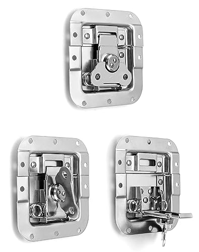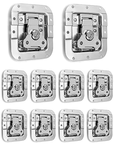 - Material: Spring Loaded Latch is made from durable metal and features a chrome-plated finish. It is waterproof and rust-proof, making it perfect for outdoor use., Recessed Butterfly Twist Lock, Recessed Depth: ½" (12 mm), for Box Thickness: >¾" (20 mm)., Maximum opening angle: 125°. Padlock hole: 6 mm, Padlock function for security., Package: Includes 10 pcs Butterfly Latches for Rack and Pedal Board Cases., Application: Suitable for flight case, road case, microphone case, multi-function case, wooden case, aluminum tool case, photographic equipment case, etc.