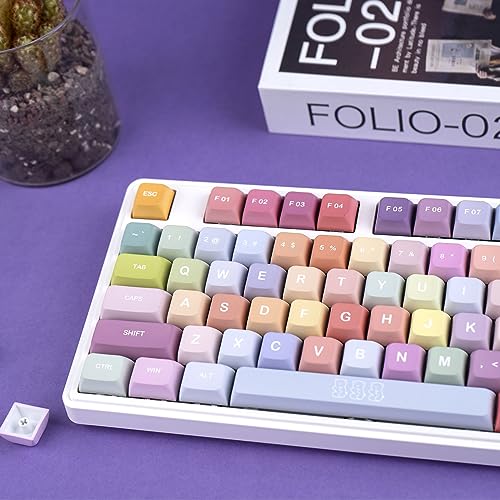 - VIBRANT AND FUN DESIGN: The keycaps feature a range of candy colors, creating a playful and eye-catching aesthetic for your keyboard. The vibrant hues add a touch of personality and liveliness to your typing experience, HIGH-QUALITY PBT MATERIAL: These keycaps are made of high-quality PBT material that is durable and resistant to wear and tear. They won't fade or warp even with long-term use. Compared to ABS, PBT is more durable and stable, and less prone to yellowing or warping over time. PBT also has excellent resistance to grease, dust, and stains. Ensure a better user experience, FIVE-SIDED DYE-SUBLIMATION PROCESS: This keycap uses a five-sided dye-sublimation process, with high color saturation and clear colors. It is not easy to fade, giving the keycap a good visual effect, XDA PROFILE: These keycaps feature the popular XDA profile, which offers a comfortable and ergonomic typing experience. The uniform keycap shape and flat top surface allow for a smoother typing experience, reducing finger fatigue and improving typing accuracy, WIDE COMPATIBILITY: The keycaps are compatible with most mechanical keyboards that use Cherry MX switches, fit for 61/64/68/84/104/108 mechanical and optical keyboards, making them a suitable choice for anyone looking to upgrade their keyboard's appearance and feel, EASY INSTALLATION: This product comes with a key puller, which can help you remove the keycap from the keyboard conveniently for quick and hassle-free installation, PERSONALIZED COMPLEMENTARY KEYS: This set of keycap has a large number of complementary keys allowing you to assemble different styles of keyboards according to your preferences and creative ideas
