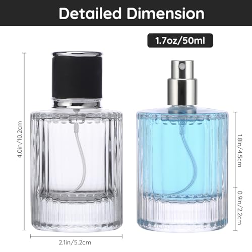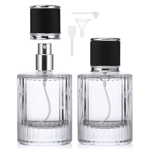 - 【Stylish Look】Set of 2 glass perfume bottles, each 50ML, measured 2.1x 4.1in/5.3x10.3cm. Elegant and chic look design, it's a great gift for your friends and family. Compact and easy to carry, fits comfortably in your treasured bag., 【Fine Mist Atomizer】With the utilization of high precision nozzle, these perfume bottles provide a fine and even mist spray, it is great for dispensing perfume., 【Leak-proof Design】Made of high impact glass, the nozzle is tight fitting, the opening is structure screw, which is solid, wear-resistant and durable. No worry of breaking or leakage., 【Easy to Refill】Comes with 1*FUNNEL+1*DROPPER+1*PUMP, you can easily dispense liquid into the perfume atomizer, Can reuse after cleaning., 【Multi-application】Ideal for perfume, fragrances, cologne, face spray, toiletries product, various water-based liquids in mind. An ideal cosmetic accessory for daily activity, especially for traveling and outgoing.