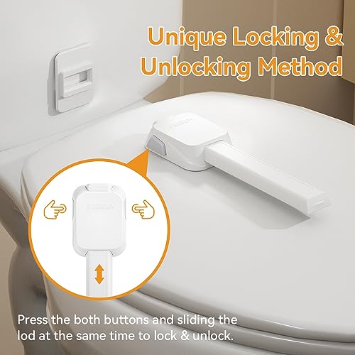 - Easy to Install---Install the EUDEMON Toilet lock with Adhesive, no drill and tools need.Tape with strong viscous (Effect will be better after 72 hours.)Can be removed without any residual, no harm to the toilet surface., Why need it---Prevent little hands & pets from opening the toilet lid and get injured; prevent babied & pets play with the toilet and make a mess of the bathroom., Unique Locking & Unlocking Method--- Compared with similar products on the market, EUDEMON's toilet lock with unique locking & unlocking methods. Press the both buttons and sliding the lod at the same time to lock & unlock. Operation with both hands, safe and reliable., Thinner Design---Compare with the similar lock in the market ,EUDEMON's toilet lock with thinner design meets more customers' needs., Updated Catcher Design---The Updated Cather Design helps to fit more toilets and smaller opening gap .It can withstand 150N(15kg)force ,feel free to use.