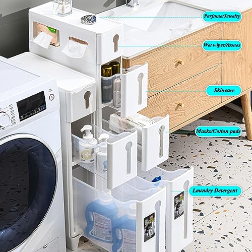 - ☛【Put It Anywhere You Need】Clean straight-line design makes this bathroom cabinet looks simple and elegant. This side cabinet fits most decorating styles, and its clean surface and pure white can add even more sparkle to your home. The narrow storage cabinet gets a small footprint due to its slender design that can utilize the spare narrow space in the bathroom, living room, bedroom, entrance, or corridor., ☛【Practical Design】Transparent bathroom organizer shelf can be visualized and easy to find things. The simple and beautiful grooved handles are easy to use. With non-slip wheels at the bottom, can be moved freely, labor-saving and convenient, cleaning without dead ends. Moreover, the surface of the boards are decorated with carved grooves, providing a touch of vitality to the pure white appearance., ☛【Selected Materials】They are made of sturdy, water-resistant plastic to protect the kitchen cabinet from water on the floor. Strong load-bearing capacity, not easy to deform, Easy to clean without fear of fumes. All the materials and fittings are subject to rigorous tests, so safe for your long-term use. Just so you know that we care about your health more than you do!, ☛【Multiple Storage Options】This vertical freestanding cabinet is not only a bathroom floor cabinet for toiletries, but also a display shelf in the living room to place trophies, collections, a pantry in the kitchen to put spices and tableware, or a bookcase in the study or bedroom for books and clothes. Help you get a tidy and clean living space., ☛【Simple Structure & Easy Assembly】All parts are shipped in one package with easy-to-understand assembly instructions and the corresponding assembly tools. You can assemble this simple organizer stand by yourself and put it into use as quickly as possible. If you encounter any problems, please feel free to contact our professional services team.