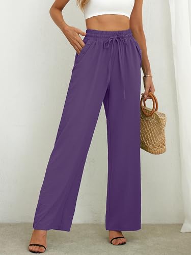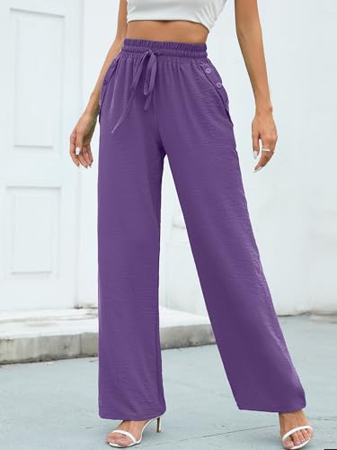 Heymoments Wide Leg Pants for Women's Casual Drawstring Loose High Waist Purple Medium Pants Adjustable Tie Knot Straight Long Belted Trousers with Pockets