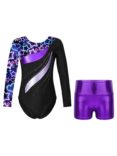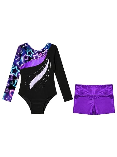 - Made of quality material, skin-friendly, breathable and comfortable to wear, Size Table means age range for girls, but they are for general guidance only, Long sleeve, round neckline leotard is decorated with shiny rhinestones, printed and patchwork style, Matching high-waisted shorts, metallic appearance. Slim fit, nice seam. Fashionable set for your girl, Suitable for dance, stage performance, competition, gymnastics, etc