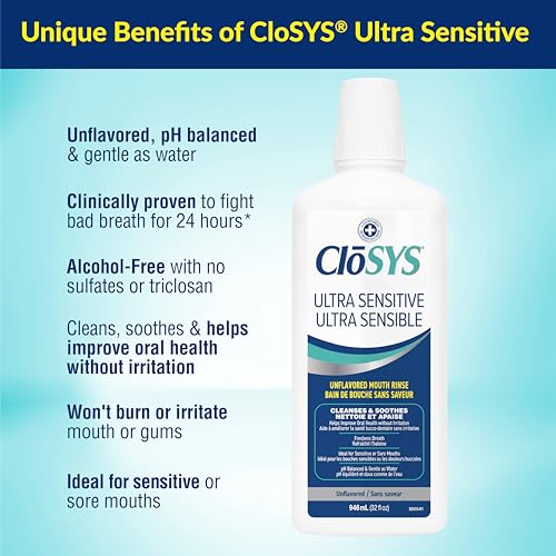 CloSYS Ultra-Sensitive Oral Rinse - Unflavored Mouthwash, Alcohol-Free, pH Balanced - Soothes Sensitivity, Eliminates Bad Breath - 32 oz