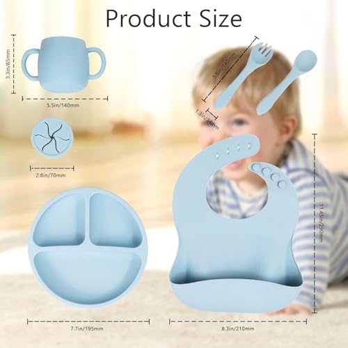 - 【COMPLETE BABY FEEDING SET】: The complete line of premium toddler feeding supplies includes a dinner plate with three pockets, a pair of forks and spoons, a cup with optional lid, an adjustable waterproof bib. With our deluxe feeding set, your little one has the highest quality feeding set to develop their self-feeding abilities. Your child deserves the best!, 【Safety You Can Trust】: Made of 100% high-quality food-grade silicone, meeting the highest food safety standards. Our sets are BPA free and free of PVC, phthalates and other harmful chemicals., 【EASY TO USE AND CLEAN】: Our feeding set helps your baby transition to self-feeding with ease! Silicone bibs are lightweight and adjustable. The utensils can easily be placed in the dishwasher after use, making cleanup a breeze. Pack for travel with ease!, 【Unique Customization】: Our dinner plate can be customized, click "Personalization" to start immediately, choose a pattern you like, and add the baby's name to create a unique set of tableware., 【Perfect Baby Shower Gift】: Our premium feeding supplies set will "wow" friends and family as the perfect gift. This set will entertain parents and toddlers for years to come. Guaranteed to be a hit at any baby shower or baby registry!