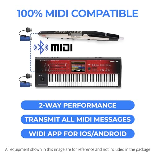 - [Limited Blue Edition] Add Bluetooth MIDI to your MIDI devices and reduce the cable clutter in the studio. Enjoy freedom on stage. Powered via MIDI Out. No batteries needed. Check out bluetoothmidi(dot)com to find out if your device is compatible., [Plug, Pair & Play] Pair automatically between WIDI devices and Bluetooth MIDI controllers. Send all MIDI messages, incl. SysEx & MPE. Connect manually with iOS, macOS, Win10/11 & Android via simple step by step guides. Detachable design for keytar & EWI., [Ultra low 3ms latency] WIDI offers highly effective Smart Connectivity Algorithms with a latency of only 3ms between two (2) WIDI devices. Minimize interference with Adaptive Frequency Hopping. Maximize reach to 65ft plain sight range., [Optimise] Explore WIDI App (iOS/Android) for lifetime updates. Optimise performance for latency or jitter. Create groups of up to five (5) standard Bluetooth MIDI controllers and WIDI devices., [!! Attention !!] General Bluetooth pairing does not work for Bluetooth MIDI. Update firmware via WIDI App first. Follow the exact pairing instructions for optimal performance. Get 24/7 support via bluetoothmidi(dot)com.