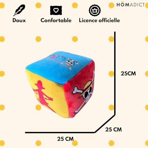 - Material and finishes: Filled with polyester fibres for unparalleled softness, it measures 25 cm wide and 25 cm thick, providing optimal comfort with each use. The details are painstakingly embroidered, adding a touch of authenticity to this must-have accessory.", Multifunctional: decorative gaming cushion for your living room or bedroom. It can be used in many scenarios and will be your everyday companion., COMFORT: This cushion is both durable and easy to maintain, whether by hand or in the machine. It is a must-have for all fans. Made by Hômadict, the reference in cocooning, it is an authentic object, guaranteeing quality and originality., OFFICIALLY LICENSED: All Hômadict cushions are officially licensed and are therefore real collectibles for fans of all ages., Officially Licensed One Piece Product