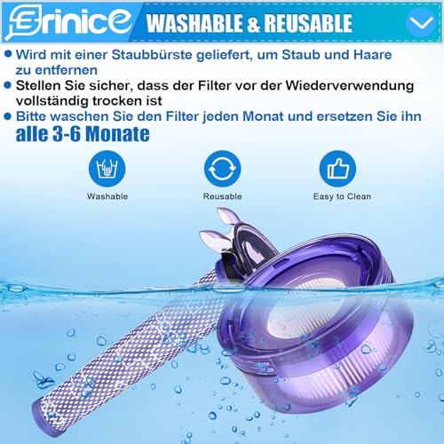 - š ćWide Compatibilityć-- Erinice Replacement filter is perfect compatible with Dyson V8, V7 new version cordless vacuum, V8 Plus, v8 origin, v8 origin plus, v8 animal extra, sv25, sv37 cordless vacuum, for Dyson v8 focus mattress handheld vacuum spare part, replace to part # 965661-05. ( Please check your model on the top of your v8 cordless vacuum cleaner model clearly before placing an order, to avoid mistake purchase!!!), š ćWashable & ReusablećV8 Origin+ Filter Accessories for Dyson Cordless Vacuum Cleaner are washable and reusable. It is recommended to clean the v8 pre-motor and HEPA filter once a month and replace it every 3-6 months for longer service life and higher cleaning performance. Just simply rinse it with clean water, wait for it to air dry completely and then use it again., š ćEasy to Replaceć The installation for dyson v8 Focus Mattress Handheld Vacuum HEPA filter is easy, can install without any tool. The filter set compatible with Dyson vacuum sv25 are designed to clean area rugs and deep clean all sealed hard floors including wood, hard floor, tile, area rugs, marble and laminate. And also have good air permeability and strong adsorption force, giving you a clean living environments., š ćHigh Efficiency Filtrationć sv37 Filter for dyson is made of 2 HEPA filters with H13 efficiency and 2 pre-filters textured surface filters with 60 PPI density, according to the original size to ensure higher suction power. It can also handle 99.97% of particles as small as 0.3 microns, improves the air quality in your home and ensures better fresh air and a healthier living environment, which is especially useful in households with children, pets or smokers., š ćSuper Value Packageć You will get 2pcs star pre-motor filter, 2pcs post filter and 1pc cleaing brush.This filter replacement set for Dyson V8 V7 Advanced Cordless Vacuum, V8 Origin+, SV25, SV37, for Dyson V8 Focus Mattress Handheld vacuum can meet your needs for half a year, it is also the best choice as gift for friends or family. If you have any problem, please contact Erinice Customer Service Team in time, and we will try our best to solve your problems.