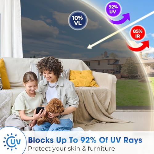 - Heat Blocking & Energy Saving: One way window film reflects some of the heat back out, minimising heat transmission through the glass. Stay cool in the summer and warm in the winter, helping reduce expensive heating and cooling costs, Daytime Privacy Protection: Protect your privacy during the day with our one way window film, which one side with the more light which one has the mirror-like appearance. So please remember to draw curtains during the night, Sun Blocking & Glare Control: Coavas window film can effectively block out 98% of UV rays, effectively preventing furniture from aging and fading. Say goodbye to direct sunlight shining into your home, protecting your eyes and preventing skin damage, Mirror Effect: Transform your room with our privacy window film with a stunning mirror effect. Make your windows a stylish focal point while increasing privacy and reducing glare. Ideal for office, home and shop windows, Static Cling and Reusable: Our window tint does not contain any adhesives, applies easily with plenty of water, and does not leave any marks on your windows when you peel it off. Tips: Vacuum glass, double glazing, patterned glass and wired glass are not applicable