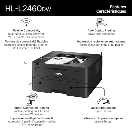- Compact. Durable. Affordable. This compact and durable machine delivers sharp, dynamic black and white prints at an affordable price., Refresh EZ Print Subscription. Never worry about running low on toner again with this optional subscription service that saves you up to 50% on Brother Genuine Toner.3 Get started today at Brother.ca/refresh., Simple connectivity. No IT team required. Connect to multiple devices with built-in dual-band wireless (2.4GHz/5GHz), Ethernet or locally to a single computer via a USB interface., Brother Mobile Connect goes where you go. This free app lets you manage your printer remotely, print anytime, from almost anywhere, plus order Brother Genuine supplies, track toner usage and work on the go.4, Paper handling that can tackle just about any job. Enjoy seamless, easy, reliable everyday printing with the 250-sheet capacity paper tray,2 or use the manual feed slot for envelopes and specialty paper.