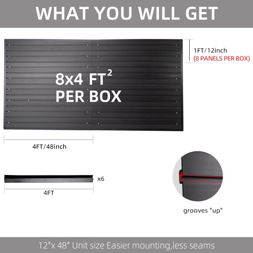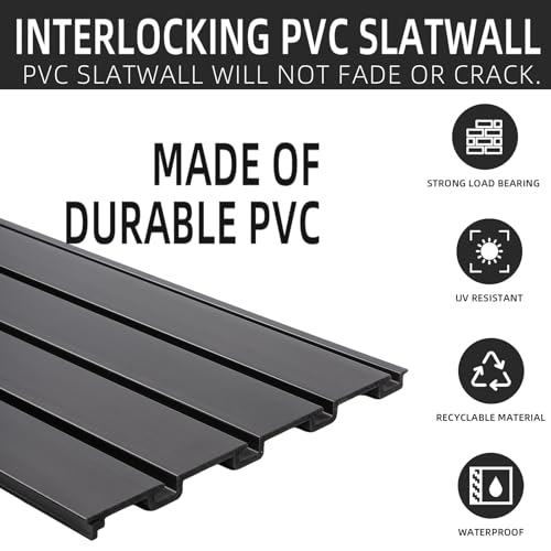 - [DURABLE GARAGE FLATWALL STORAGE SYSTEM] Our premium PVC wall organizers are built to withstand harsh conditions and are 30 times more durable than drywall. They are fireproof, waterproof, fade-proof, dry-proof, crack-proof, peel-proof, and hold up to 75 pounds per square foot., [UNIQUE DESIGN & MODULARITY] Our slatwall pegboards feature a T-slot design that is compatible with most hooks, shelves, garbage cans, baskets and slatwall accessories!, [EASY TO INSTALL SLAT WALL PANELS] Each of our slat wall panels measures 48'' x 12'' and can be installed quickly with tools such as a level and cordless drill, reducing installation time by 40%., [PEGBOARD TOOL ORGANIZER] Ideal for organizing your tools, this pegboard wall organizer system is the perfect solution if you have a lot of items strewn about on your workbench or are tired of rummaging around in a toolbox that's too small for you., [QUALITY ASSURANCE & CUSTOMER WARRANTY] Each garage organizer and storage rack is carefully quality checked before shipping, we use reinforced outer cardboard boxes and extra edge protection, if you have any questions, please contact us and we will reply within 24 hours.