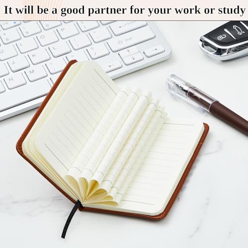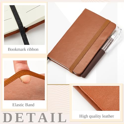 - More Than You Need: with each package containing 8 leather pocket notebooks and 8 mini pens, these mini pocket notebook sets are ideal for personal use or office supplies, or as a generous gift for students, friends, colleagues, etc., it offers quantity and quality in one package, ensuring you never run out of space to illustrate your creativity, Conveniently Compact Size: never miss jotting down your thoughts, reminders, or meetings with our lined leather journal approximately 4.3 x 2.5 inches in dimension, easily slipping into your purse, bag, or pocket, paired with the 4.13 inches long pens, it ideally embodies compactness and portability, Feature Filled for Convenience: these mini leather notebooks with pens are not just about looks and durability, each notebook pocket has an array of functional features such as a 100 page capacity (50 sheets), ruled lines for writing, an elastic pen holder for secure placement, round corners to avoid unwanted paper cut mishaps, and bookmark ribbons to mark your place, Quality Material: indulge in the rich texture and durability of these mini pocket notepads made with leather covers, water resistant and soft, designed to withstand daily wear and tear, each page rolls out smooth paper for effortless writing; Accompanying them are sleek plastic shell pens filled with black ink, creating an unmatchable writing experience, Stylishly Sophisticated Appearance: achieve a minimalist yet stylish note taking action with the brown cover of the hardcover mini journal with pen holder, the pens' brown shell enhances the overall aesthetic appeal, exuding a sense of sophistication, making it a nice gift for people who love reading, writing, and sketching, or a personal accessory