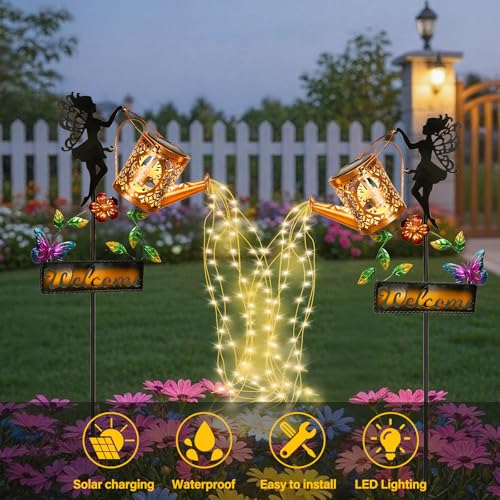 - PERFECT DECORATION: The watering can lights will be an attractive decor in your garden,yard or outdoor during the night, this solar watering can emits warm yellow lights, looking like a string of shining stars poured from the watering can,projecting beautiful patterns on the ground ,to create romantic atmosphere. The garden light can bring you fantastic feeling in your garden, patio, lawn and yard at night., SOLAR POWERED: Built-in light sensor,this watering can solar lights will automatically turn on in the dark and turn off automatically during the day. This solar lamp can be used for 8-10 hours after charging for 6-8 hours. Tips: Please expose the solar panel to the sunlight, and make sure that the solar panel faces the sun directly., EASY INSTALLATION: Solar watering can use high-quality metal material, waterproof and rust-proof. Not easy to break and No need to assemble when using, this watering can with light can be hung directly by the included shepherd hook., WIDE APPLICATION: Our solar watering can with lights(with Shepherd Hook) is good for DIY: watering plants, tree vines, potted, decorations, wedding, party ,dinner table, porch, bedroom, window, balcony, wall, Christmas,Thanksgiving, birthday , anywhere indoor or outdoor decor., BEST GIFTS IDEA: This garden fairy lights is a unique and nice decoration for the garden, yard, and outdoor,it brings a special twinkle and warm atmosphere;it is also a perfect gift for Eid Mubarak, Mother's Day, Father's Day, Birthday Gift, Gardner's gift.