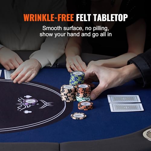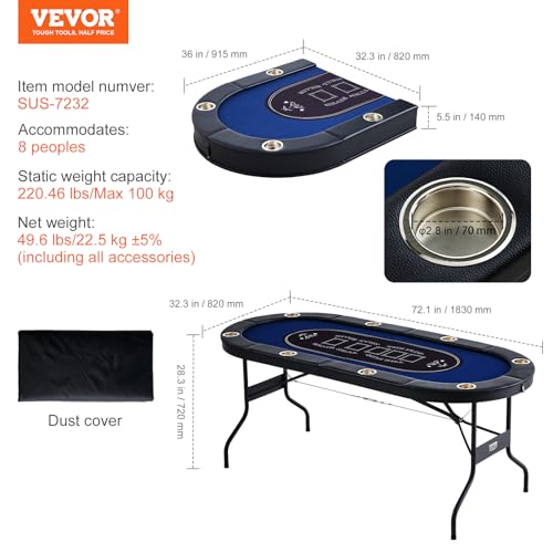 - 72 inch Large Poker Table: This perfect-sized poker table accommodates up to 8 players simultaneously, making it ideal for family gatherings, entertaining friends, bar games, and more. The comfortable and convenient gaming experience will make you feel like you're in a Las Vegas casino, allowing you to enjoy games like Texas Hold'em and other card games to your heart's content., Tool-Free Assembly: Designed with a foldable feature and a secure lock, this blackjack texas holdem poker table allows you to quickly set it up or fold it for storage. The safety lock firmly secures the table, preventing it from collapsing or coming loose when in a folded state. When not in use, you can easily store it in a corner without taking up too much space. It also comes with a dust cover to keep the table clean., Sturdy and Stable Frame: The casino leisure card board game table features a high-quality, sturdy metal steel frame that provides stable support for the poker table. The thickened table legs, made from high-quality metal, ensure durability and long-lasting performance., Comfortable Design: Soft armrests are placed between the tablecloth and the board, providing both comfort and dust protection. The leather cushioning around the casino leisure table's edges is waterproof, durable, and easy to clean. Each player position is equipped with built-in stainless steel cup holders that are spacious and deep, allowing you to enjoy your drinks without worrying about spills., Smooth and Wrinkle-Free Felt Tabletop: The felt tabletop is smooth and free of wrinkles, made from wear-resistant material. It ensures smooth gameplay without any hitches when checking cards, handling chips, or revealing your hand. Even with prolonged use, the felt surface remains free from pilling.